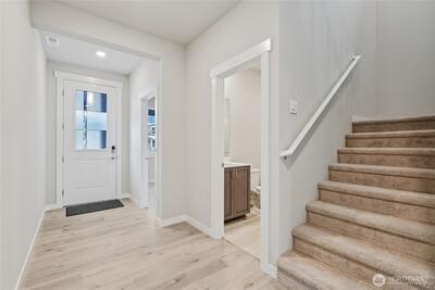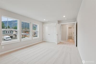 Experience the Legacy at Harrison Court, by D.R. Horton, set beneath the stunning Cascade foothills in North Bend. This thoughtfully designed home offers the perfect balance of space, comfort, and convenience—just a short and easy commute to Bellevue and the greater Eastside tech corridor. Situated on a sun-filled homesite with a generously sized side yard, this property has rare outdoor flexibility ideal for play, gardening, or relaxing in your own private space. The expansive lot allows for more breathing room than typical new construction, giving you both light and livability. Inside, the open-concept layout is designed for modern living, featuring a main-level bedroom perfect for guests or multi-generational needs. The spacious great room flows seamlessly into a well-appointed kitchen complete with stainless steel appliances, quartz countertops, and a large walk-in pantry—ideal for everyday living and entertaining alike. Upstairs, enjoy oversized bedrooms and walk-in closets th