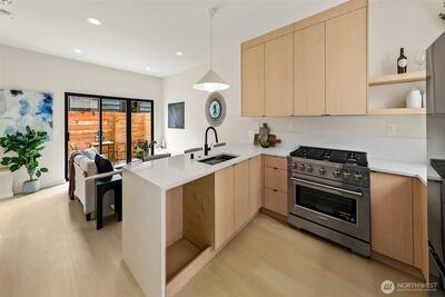 Modern Crown Hill townhouse with a private rooftop deck offering sweeping city views and designer finishes throughout. This newly constructed 2-bedroom, 2.5-bath home features approximately 1,100 sq ft of efficient, light-filled living space with an open-concept main level, hardwood floors, vaulted ceilings, and a chef-inspired kitchen with quartz countertops, sleek cabinetry, and a premium 6-burner gas range, plus a convenient powder room. Each bedroom is situated on its own private floor with an en-suite bathroom, providing ideal separation for guests, roommates, or a home office. Energy-efficient mini-split systems provide heating and A/C on every level for year-round comfort. Enjoy both a private patio and a fully fenced backyard, along with a stunning rooftop deck—perfect for entertaining or relaxing. Includes an assigned parking space. Ideally located near Crown Hill amenities with quick access to Ballard, Greenwood, Golden Gardens, transit, and major commuter routes. Last home