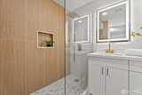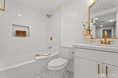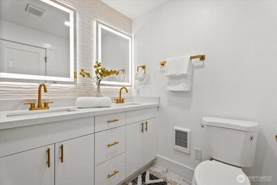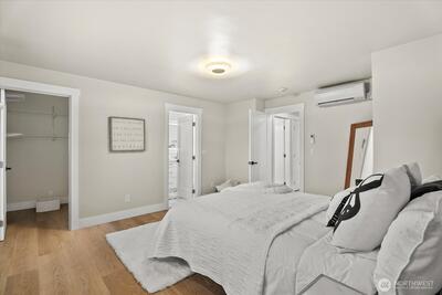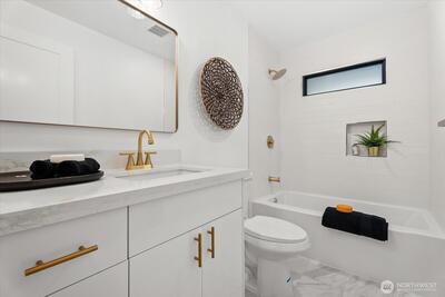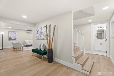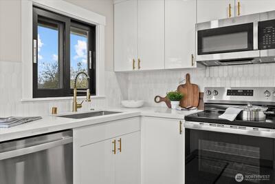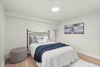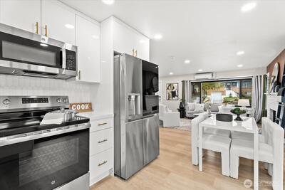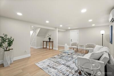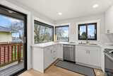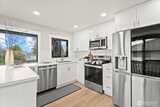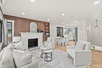 Step into this beautifully remodeled home where modern design meets everyday comfort. A bright, open layout welcomes you with natural light, leading into a stunning kitchen featuring brand-new cabinetry, quartz countertops, and stainless steel appliances. Enjoy a partial view of Lake Washington that adds a special touch to your daily living. The main level offers a serene primary suite with a luxurious bath, LED mirrors, and dual walk-in closets. Downstairs, a fully finished lower level provides space to relax or entertain with a cozy rec room, wood-burning fireplace, third bedroom, and a new full bath. Complete with fresh paint, LVP flooring, mini-split A/C, a fully fenced yard with a new deck, EV charger, and private garage with driveway. Zoned NR3 with DADU potential. Pre-inspected for peace of mind. Passed building permit inspections from the City.