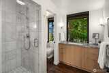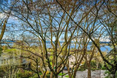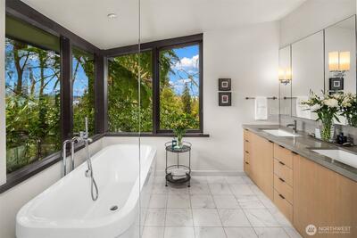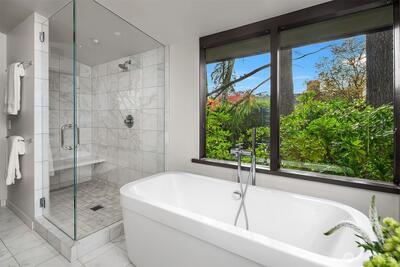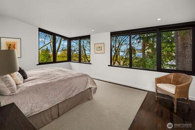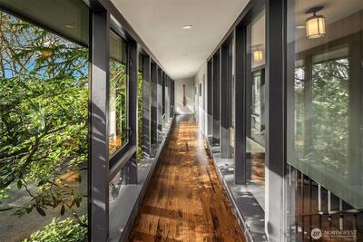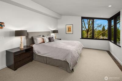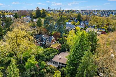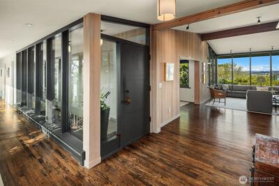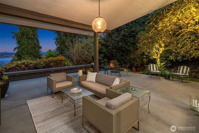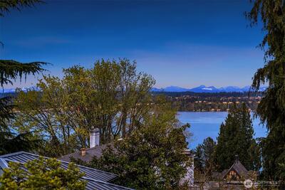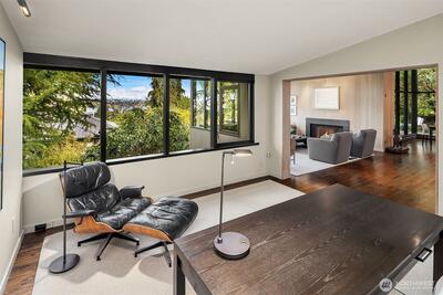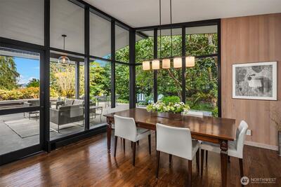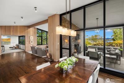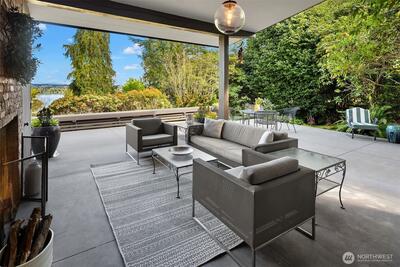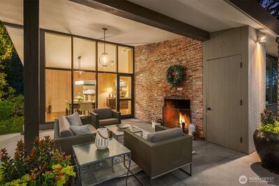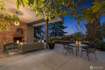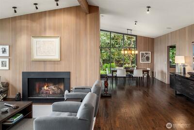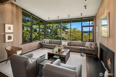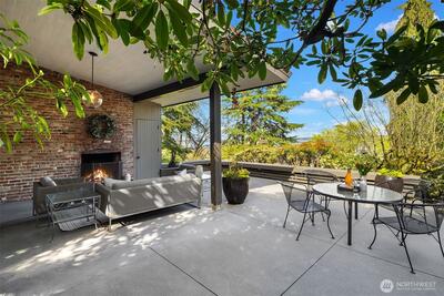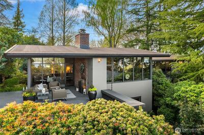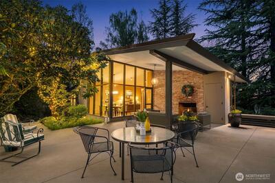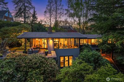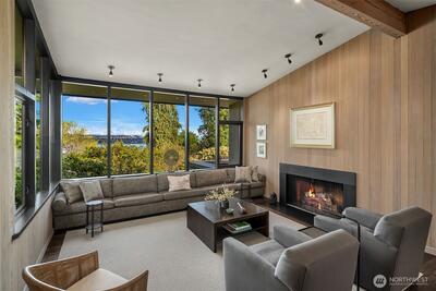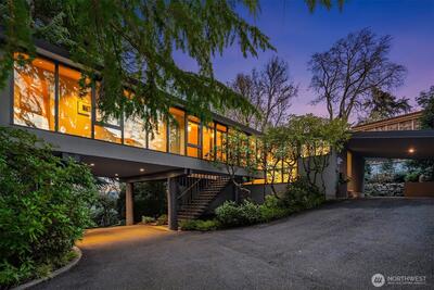 Thoughtfully sited high off a coveted street in Washington Park, this exceptional mid-century modern residence—originally designed by renowned Northwest architect Roland Terry and thoughtfully refined by Steve Hoedemaker—offers a rare blend of architectural pedigree and modern comfort. Enveloped by lush, curated gardens of magnolias, camellias, rhododendrons, and other ornamentals on a 14,400 SF lot, the home captures filtered views of Lake Washington, Bellevue, and the Cascades. Walls of glass frame outlooks from every room, creating a seamless connection to nature anchored by the fireplace – one in living room and one for the outdoor space. The expansive living and dining areas flow to the inviting outdoor patio perfect for hosting memorable gatherings. The spacious kitchen with limestone counters and updated appliances will serve your daily and special event needs complimented by an adjoining relaxed media room and guest bath. A serene and luxurious primary suite with dressi