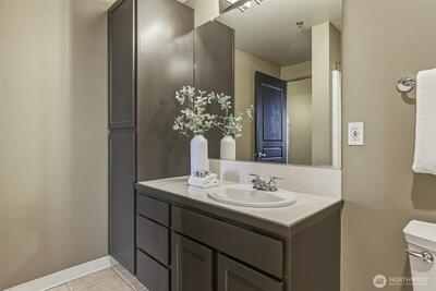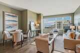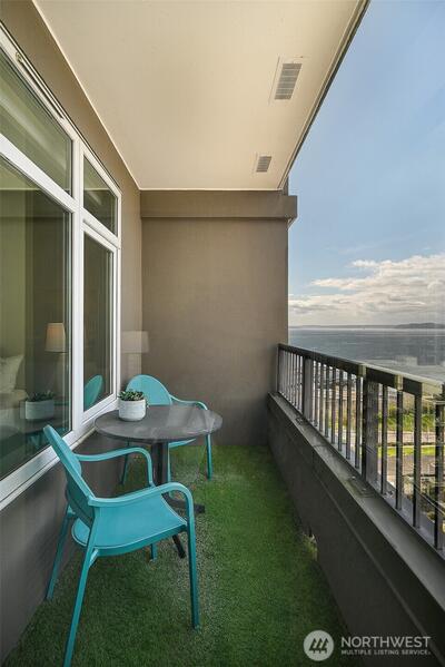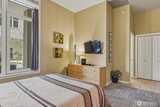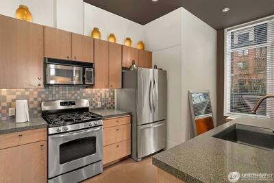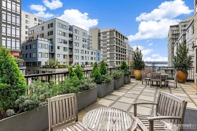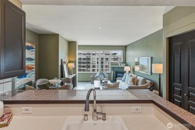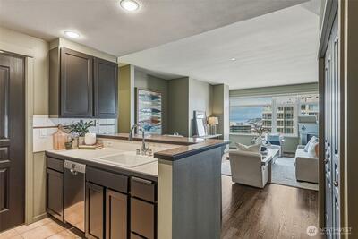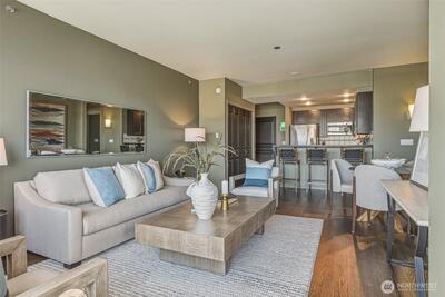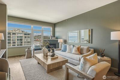 Experience stylish city living in this chic, thoroughly updated home at the fabulous, amenity-rich Ellington. This light-filled unit features refinished hardwood floors, new carpet, designer paint colors, newer stainless kitchen appliances and a brand new in-unit laundry. Enjoy fantastic closet and storage space (walk in closet in bedroom, full wall pantry/household goods/coat closet off kitchen and abundant cabinetry in the full bath) and a cozy gas fireplace—plus unforgettable Sound, Mountain and City views overlooking the Space Needle and Sculpture Park. The Ellington is a beautifully maintained, full service community with 24-hour concierge service, two guest suites available for nightly rental, a well equipped fitness center, inviting indoor and outdoor gathering spaces, conference/meeting room and reservable party space. The HOA is strong and well-managed with no special assessments, and the building is pet-friendly with no rental cap. Assigned parking and storage are inc