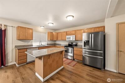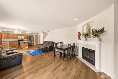 Welcome to this well-maintained 4-bedroom, 2.5-bath home in a private gated community. Thoughtful two-story layout offers 2,070 sq ft with open-concept living, spacious dining area, and a kitchen featuring granite counters, center island, and stainless appliances. Main level flows nicely for everyday living and entertaining, with abundant natural light and a cozy fireplace anchoring the living space. Upstairs includes generously sized bedrooms, convenient laundry area, and a spacious primary suite with dual vanities, soaking tub, separate shower, and walk-in closet. Attached 2-car garage, fenced backyard, and neighborhood sports court add to the appeal. Convenient location near everyday amenities, commuter routes, and JBLM.
