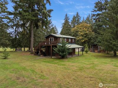 Private 5-acre Longbranch homestead with major upgrades, including a new 50-year copper roof + all-new trusses ($130K investment), solar panels, backup propane generator. Solidly built home offers 3BR/2BA with 2 bedrooms + 1 full bathroom on main floor, gourmet kitchen w/granite counter tops, real river rock stone fireplace, main-level soaking tub, laundry downstairs, and spacious upstairs primary suite w/bathroom ensuite, walk-in closet, and sitting room off primary opening to covered private deck. Indoor solarium w/hot tub, Exteriors features horse stalls, dog kennels, large chicken coop, barn, greenhouse, detached workshop w/two sliding garage doors on each side of the worshop + finished upper level w/electricity, custom two-story treehouse, large deck w/gazebo, circular driveway, and ample space for RVs, boats, equipment. No HOA. Perfect use for a homestead, hobby farming, or contractor property theres plenty of storage for heavy use or industrial equipment on this property. Cl