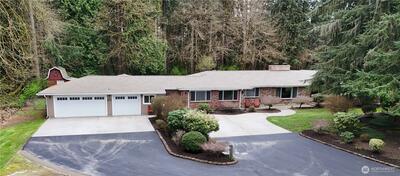 Welcome to this well appointed, immaculately maintained, 5 bedroom, 2.75 bath 1 story home on a generous 1.64 acre lot. Outdoor enthusiasts will enjoy the huge open yard with sport court, pond with waterfall, chicken coop and plenty of space for gardening and summer entertaining! The thoughtfully designed floorplan centers around the living room with stunning fireplace that flows through into the dining area. Most rooms have huge windows to bring in the natural sunlight and to take in the peaceful private park-like views of the yard. Just beyond the spacious well appointed kitchen you'll find a formal dining room with built in cabinets, an expansive bonus room, bathroom and laundry room. The primary suite includes an en-suite full bath with radiant heat floors and walk-in closet. The oversized 1341 sq ft 3 car garage is fully finished and has tons of workspace and an oversized 3 compartment stainless steel sink. Off the garage there is a full bathroom and heated finished fitness room o