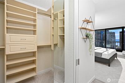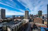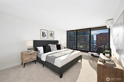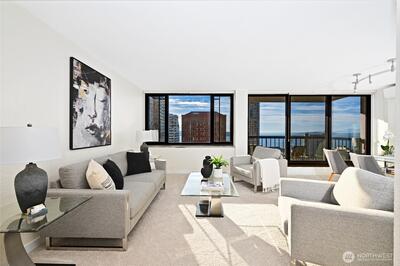 Step outside and you're in the middle of one of the most vibrant, walkable cities in the country. Step inside, and the city melts away into your own private sanctuary with unobstructed, protected views of Puget Sound, the Olympic Mountains, and the Seattle skyline. One of the best view values in the city, without question. This Belltown condo carries the lowest HOA dues per square foot in the neighborhood, with those dues covering all utilities, electricity and water included. Strong reserves and no special assessments. The westward exposure means the light builds beautifully through the day and gives way to unforgettable sunsets, all framed by floor-to-ceiling windows and two private balconies. Ferries, ships, wildlife, fireworks over the Sound, the Space Needle. The view is dynamic and ever-changing. The home is move-in ready and thoughtfully updated: air conditioning, in-unit washer/dryer, a large secure garage parking space with EV charging, and oversized private storage.