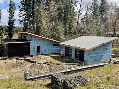 Exceptional opportunity to complete a custom home your way—ideal for investors or buyers looking to create a dream home with built-in equity in the highly desired Artondale area. This 2,904 sq ft residence offers 3 bedrooms and 3 bathrooms with a well-designed layout, including a primary suite on the main level. Constructed with SIPS insulation throughout for superior energy efficiency, the home is filled with natural light from multiple skylights. Planned features include a spacious kitchen with a huge walk-in pantry, European bathroom fixtures, Geberit toilets, and a no-step walk-in shower for a sleek, modern feel. Step outside to a massive deck overlooking 7 private, wooded acres—peaceful, secluded, and full of potential. The property is already equipped with well and septic systems, adding significant value and saving time on development. A durable steel standing seam roof is already in place. A large detached 2-car garage with an attached storage building provides amp