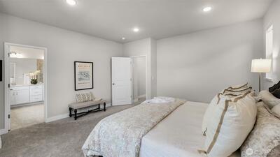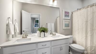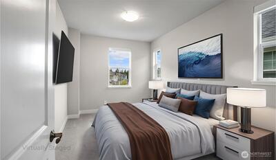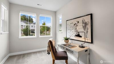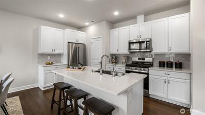 Charming nearly-new 3-bedroom Craftsman in River Trail at Elliott Farm! Light-filled open plan with modern kitchen featuring elegant white cabinetry with pull-out shelves & soft-close drawers, quartz countertops, large island with farmhouse sink, pantry, and stainless steel appliances including gas cooktop—ideal for entertaining. Spacious gathering and dining areas complete the great room. Main floor offers a private office, access to 2 car garage with storage and EV charging. Upstairs includes a spacious primary suite with luxurious bath, rain-dome shower and walk-in closet, plus 2 additional bedrooms-one with walk-in closet, adjacent full bath, a bonus loft & convenient upstairs laundry. Central heating and cooling for added comfort. Front yard space is fenced, ideal for pets & gardening. Super quiet and peaceful neighborhood. Surrounded by green spaces w/nearby trails, golf, parks. Easy access to I405 and convenient commutes to Seattle, Bellevue, & SeaTac.