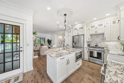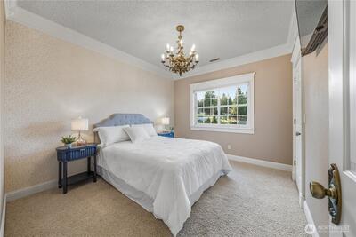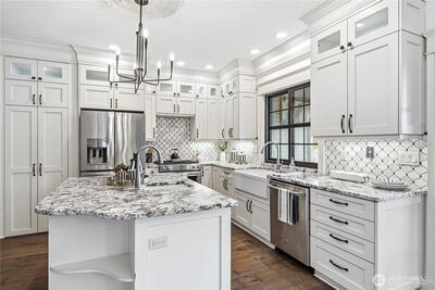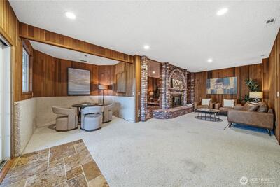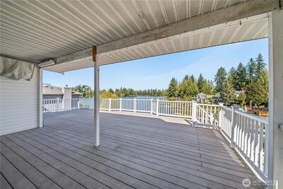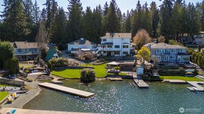 Rarely does an opportunity like this present itself on coveted Lake Tapps. Situated on two tax parcels within the desirable Lakeridge community, this exceptional waterfront homestead offers a rare combination of privacy, protected swimming waters, and expansive lake views. Spanning a combined .61 acres with 110 feet of level, low-bank frontage, the setting is truly unmatched.The thoughtfully updated 3,408-square-foot home is designed with flexibility in mind, offering 3 bedrooms plus 3 additional finished rooms—each with walk-in closets—creating an ideal layout for multi-generational living, guest accommodations, or work-from-home versatility. Formal living and dining spaces provide timeless elegance, while the spacious rec room with wet bar invites effortless entertaining. The inviting family room flows seamlessly into a beautifully remodeled kitchen, creating a natural gathering space at the heart of the home.A charming wraparound porch welcomes you, while recent updates—includ