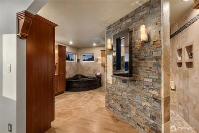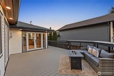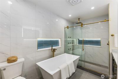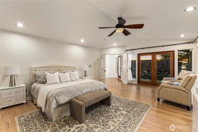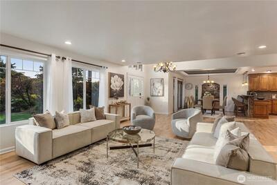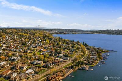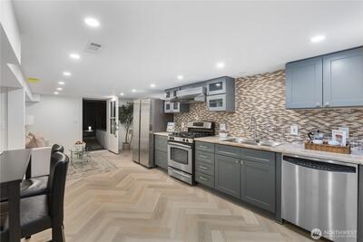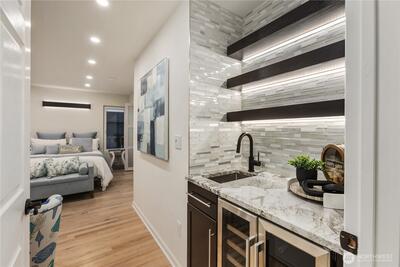 Experience this once in a lifetime opportunity in this fully remodeled home! This 5 bed, 5 bath masterpiece in Lower Kennydale welcomes you in through soaring ceilings onto new hardwood floors throughout the main level and upstairs. The expansive living and dining areas were completed with exquisite carpentry, a full wet bar, and a newly designed fireplace. Entertain in the dreamy chefs kitchen offering top of line appliances, granite countertops, a pot filler, built in coffee maker, and more-flowing easily to the back deck. The TimberTech decking offers you views of the lake and mountains, as well as multi color under-mount lighting to set the mood. The main floor primary suite is brand new, complete with a walk in closet and on-suite 5 piece bath, wet bar, gas fireplace, tilt and turn windows, new lighting, and heated flooring. A redesigned causeway guides you down to the 300 bottle wine cellar and more entertainment space. A thoughtfully designed, newly remodeled MIL Suite offers a