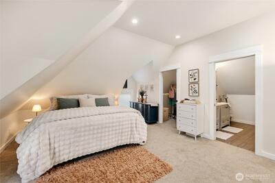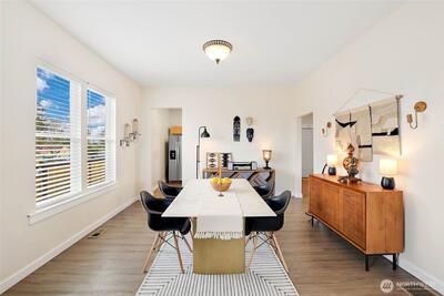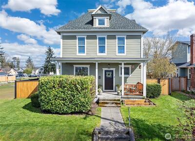 Timeless charm meets modern comfort in this beautifully updated 1898 Tacoma classic situated on an oversized corner lot in the heart of the McKinley neighborhood. Step through the covered front porch and into a grand entryway where the original wood staircase with turned balusters sets the tone for the character found throughout this home. Soaring ceilings, abundant natural light, and a flowing floor plan make this home live wonderfully large, with spacious living and dining rooms that open effortlessly to one another. The updated kitchen features shaker-style cabinetry, quartz countertops, a stylish stone tile backsplash, and a generous walk-in pantry. Upstairs you'll find bright, well-proportioned bedrooms and a beautifully remodeled bathroom with dual vanities and contemporary fixtures. A cozy bonus room with a fireplace provides the perfect space to unwind. Step outside to a fully fenced backyard retreat complete with a patio entertaining area and lush lawn, all complemented by a d
