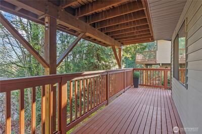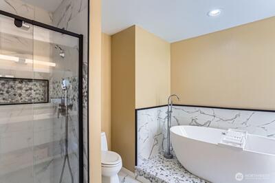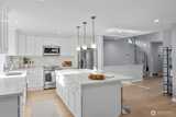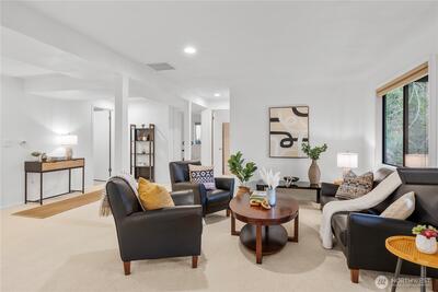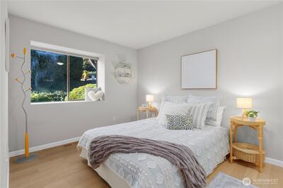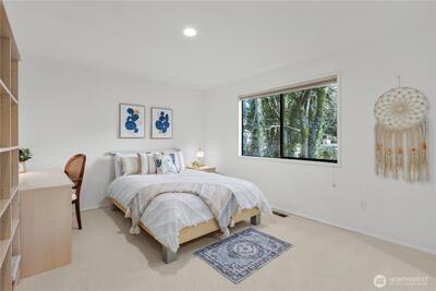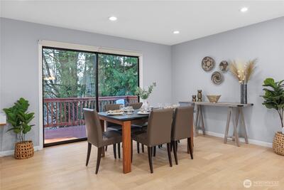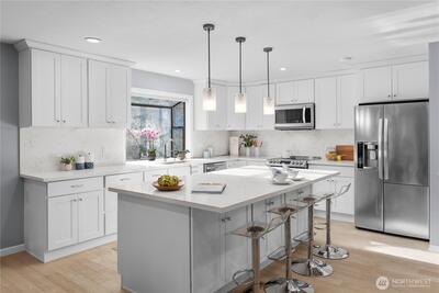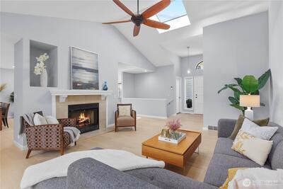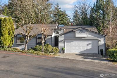 Welcome to Wildridge Park! This stunning, fully remodeled stand-alone home features 2 kitchens, 2 laundry rooms, and a separate-entry daylight basement—perfect for a mother-in-law suite. Enjoy soaring ceilings, A/C, skylights, and a gas fireplace in the bright, open living room. The chef’s kitchen boasts a quartz slab island, stainless steel appliances and has a slider glass door open to a large private deck. Luxury vinyl plank floors throughout. Spacious primary suite with walk-in closet, freestanding tub, and designer shower. A huge storge room in the basement. Bellevue Schools, easy I-405/I-90 access. Desired Bellevue School District; EZ access I405 & I90