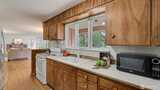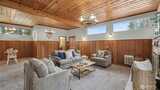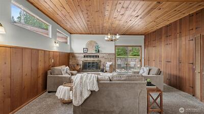 Steps from the shores of Lake Meridian, this custom one-level home on over 1/3 of an acre has so much to discover. Stately brick and rough-cut cedar siding provide enduring exterior finishes, while the spacious bonus room with wood burning fireplace, stone hearth, exposed cedar beams and extra-tall tongue and groove ceilings has the lakeside cabin vibes you dream of. Oversized picture windows in the living and dining room look out to tranquil lake views. All three bedrooms are well-sized with a full bath in the hall plus a 3/4 bath off of the bonus room which has a sliding door exiting to the backyard patio running the full length of the home amongst a lovely treed setting. Perched up and away from the street with a long driveway allowing for ample parking leading up to the extra large two-car detached garage. Trophy location features Lake Meridian park and the Soos Creek trail right out your doorstep, shopping and restaurants only a couple minutes away, plus easy access to commuter ro