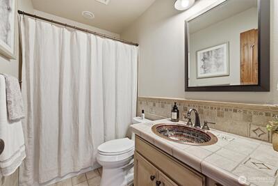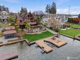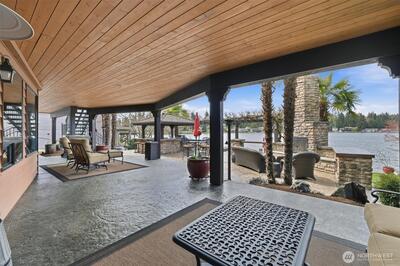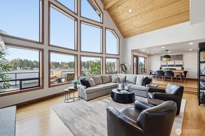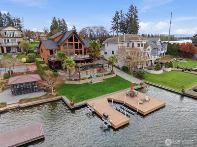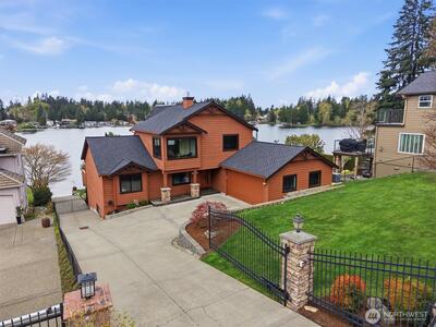 Experience the pinnacle of waterfront living with this extraordinary Lake Tapps estate. Boasting 70’ of premium west-facing shoreline, this home is designed to capture breathtaking sunsets and panoramic views from nearly every room. The light-filled great room features vaulted ceilings and a dramatic wall of windows, while the chef’s kitchen offers gas cooking, a center island, and more lake views. Retreat to the top-floor primary suite, complete with a private sitting area, walk-in closet, and 5-piece bath. The lower level is an entertainer’s dream or potential Airbnb, featuring a full second kitchen. This home has all the space you need with five bedrooms, extra finished room, bonus room, plus office! Step outside to a resort-style backyard with a massive TPO deck, covered patio, outdoor fireplace with seating area, and a custom cabana bar equipped with beer taps, sink, fridge, and BBQ. Follow the flat, manicured lawn to your private dock, featuring boat and jet ski lifts, plus