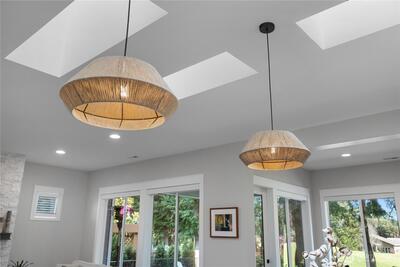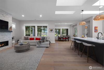 Beautifully reimagined, turnkey custom home in the highly sought-after 55+ Jubilee community, ideally situated on a private lane along the golf course. This fully updated residence showcases new hardwood flooring, LED lighting, custom millwork, & a striking stone accent wall with a 52" linear gas fireplace. Six new skylights & expansive windows fill the home with natural light, complemented by custom motorized window coverings. The modernized gourmet kitchen features new quartz countertops, pull-out drawers, a custom island, & all-new stainless steel appliances, impeccably enhanced by under/over cabinet lighting. The spacious primary suite offers stunning views of the 17th fairway, new carpet, & custom remote-controlled window coverings with a blackout option. The spa-inspired en-suite bath is newly updated with a soaking tub & a fully tiled walk-in, all-glass shower, along with custom cabinetry, quartz countertops, oversized porcelain sinks, designer lighting, & mirrors. A second en-s