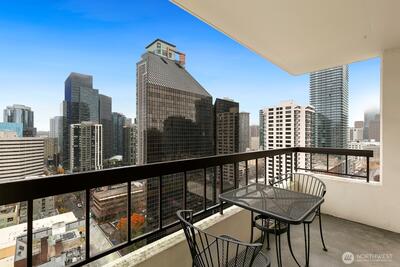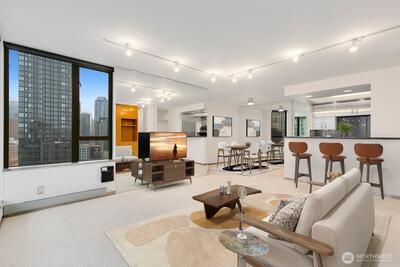 Perched on the 21st floor, this corner residence offers sweeping views of downtown, and the Space Needle. The open-concept living area features floor-to-ceiling windows and a private balcony—perfect for soaking in vibrant city sunsets. Fresh carpeting and sleek stainless details provide a polished, contemporary living experience. Parking and storage included. The building offers a fitness center, pool, hot tub, sauna, club room, expansive community deck with BBQs, and a convenient guest suite. No rental cap. 99 Walk Score. HOA dues cover water, sewer, garbage, and high-speed fiber internet.