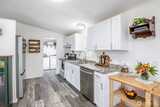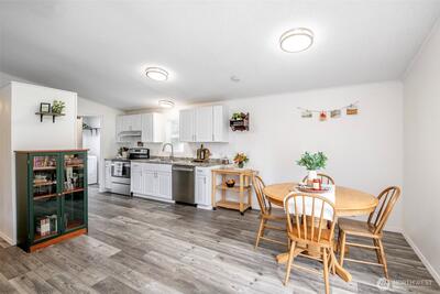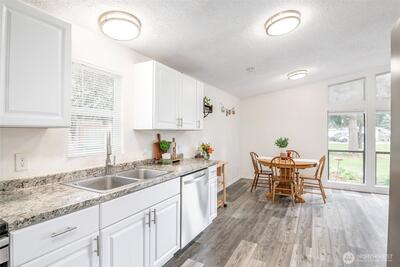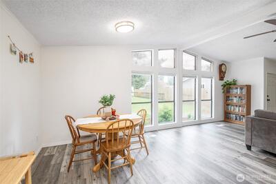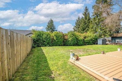 Beautifully updated rambler in the desirable Nisqually Pines neighborhood! Enjoy new flooring in the kitchen and living room, creating a fresh, modern feel throughout. The bright living room showcases vaulted ceilings and a stunning wall of windows that fills the home with natural light. The kitchen features white cabinetry, stainless steel appliances, ample counter space, and a eat-in dining area—perfect for everyday living. The spacious primary suite offers a spa-like ensuite bath with barn door entry, while two additional guest bedrooms and a full guest bath provide flexibility for guests, home office, or hobbies. Step outside to a HUGE park-like yard with an added back deck, fresh landscaping, and plenty of space for entertaining, relaxing, and outdoor enjoyment. Conveniently located just minutes from shopping, dining, schools, and entertainment—this home has it all!