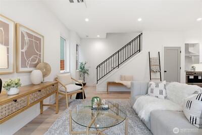 Final home with this floor plan remaining! New construction Ballard home with exceptional street presence and thoughtful design throughout. A spacious front yard enhances curb appeal and provides a welcoming entry. Soaring ceilings and large windows bathe every room in natural light, creating an open and inviting atmosphere. The 3-bedroom, 2-bath layout offers versatile living spaces perfect for those who work from home. Premium finishes include Bellmont cabinets, engineered hardwood throughout—no carpet—and heated floors in both bathrooms for year-round comfort. Mini-split A/C in every room ensures climate control through Seattle's warmer months. The primary bathroom features motion sensor lights and a dedicated bidet outlet for added convenience. Walk to NW 65th eateries and Downtown Ballard's vibrant shops and restaurants with an impressive 88 Walk Score and 95 Bike Score. Quick access to Golden Gardens Park and 15th/99 makes SLU/Downtown commutes a breeze. Top-ranked schools ne