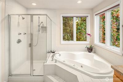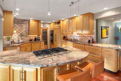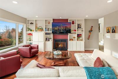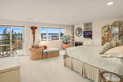 Bold contemporary design steps from Carillon Point, where western-facing views stretch across Lake Washington to the Olympic Mountains. Thoughtfully remodeled in 2006, this home was shaped around its setting, with view decks on two levels that frame the lake from both the main living spaces and the upper-level primary suite above. The kitchen anchors the main floor around a generous center island flowing naturally into spaces designed as much for gathering as for simply settling in with the view. Upstairs, the primary suite opens to its own view deck; a gas fireplace and five-piece bath complete the retreat. A dedicated home gym with its own heating occupies one bay of the three-car garage and converts back easily when needs change. This is a home where the lake is part of the daily rhythm. Carillon Point's waterfront dining and Kirkland's finest shoreline trails are steps from your door, with downtown Kirkland's shops and restaurants just minutes away. Top-rated schools, easy freeway