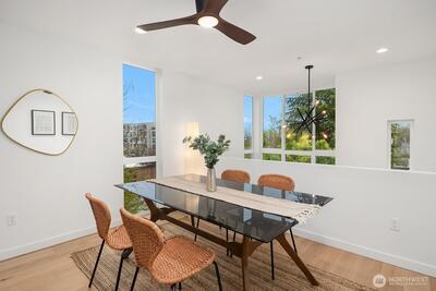 Pristine end-unit townhome offering urban privacy in the heart of Seattle, perfectly positioned between Capitol Hill and the Central District with a 95 Walk Score. At 2 bed, 1.75 bath and built in 2022, this architecturally modern home delivers the best of city living without compromise. The entry level welcomes you with a spacious guest bedroom and full bath, offering privacy and flexibility for visitors or a dedicated home office. One floor up, the open kitchen and dining area flow seamlessly into the living space, bathed in natural light from floor-to-ceiling windows and vaulted ceilings that create an airy, expansive feel. A versatile loft above provides the bonus space for dining, work, fitness, or creative pursuits. The full-floor primary suite is a true retreat, featuring a spa-inspired bath and custom California Closets. Above it all, a private rooftop deck rewards you with sweeping mountain views, ideal for morning coffee or evening gatherings, plus a small private turf yard.