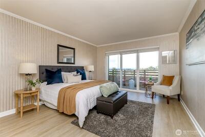 Rare opportunity with sweeping views at The Diplomat! This unique residence offers stunning views of Puget Sound, Blake Island, and the Olympic Mountains from the 2 bedrooms, living room as well as 2 private decks. Also, a rare bonus of a private 759SF lower-level 1 BR apartment (405B)—ideal for office suite, guest quarters, or multi-generational living. The main home is filled with natural light and features an open, comfortable layout designed for everyday living and entertaining. The kitchen is both beautiful and functional with granite countertops, custom cabinetry, and thoughtful built-ins. In-unit laundry room creates additional versatility—perfect for use as a pantry, home office, or additional storage space. Primary has Huge Walk-in Closet and sitting area. Large storage area in dedicated storage room near basement apt. Two parking spaces. Located in a well-maintained, pet-friendly building. Building updates include a newer PEX pipe, roof replacement 2 years ago, updated pl