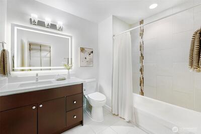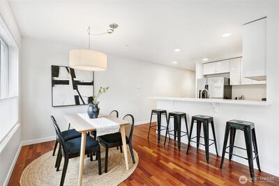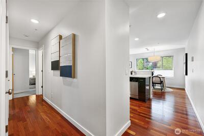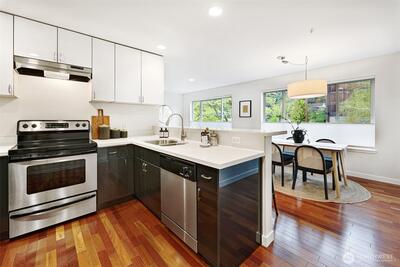 Kenmore is blossoming into a vibrant destination for those who want the best of every world: a peaceful home base, easy access to PNW outdoor activities, a great dining/brewery scene, and convenient connectivity to both Seattle & the Eastside. This is your chance to tap into that from a very rare modern construction condo built in 2015! Situated moments from Log Boom Park, the Burke-Gilman Trail & the shores of Lake Washington, this top floor abode checks every box on your list. Brazilian hardwoods & a freshly painted interior reflect abundant natural light, drawing you into the open, inviting living area ready to accommodate gatherings of any size. Pick up takeout from beloved nearby spots or show off your skills in the kitchen, equipped with stainless appliances, quartz counters & sleek cabinetry. Each bedroom includes its own full bath, while the primary also boasts a custom Elfa walk-in closet & impressive soundproofing for a great night's sleep. Upgraded with efficiency in mind, s