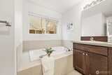 Nestled within the tranquil Cascara 55+ community, this contemporary detached townhome is thoughtfully suited for comfortable aging in place while still offering space for guests, hobbies, and everyday enjoyment. The open great room features soaring ceilings and a warm gas fireplace, creating a relaxed, easy-living environment ideal for both quiet days at home and casual entertaining. The well-designed kitchen offers rich wood cabinetry, granite countertops, stainless steel appliances, and a generous island; perfect for simple meals, conversation, and everyday convenience. The main-floor primary suite is designed for long-term comfort, providing everything needed on one level, including ample closet space and a spa-inspired five-piece bath with dual vanities and a deep soaking tub. Upstairs, two additional bedrooms, a full bath, and a flexible loft create ideal space for visitors, caregivers, hobbies, or a home office; while remaining easy to maintain. Enjoy the privacy of a fully deta
