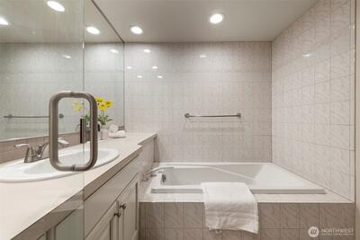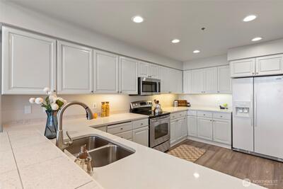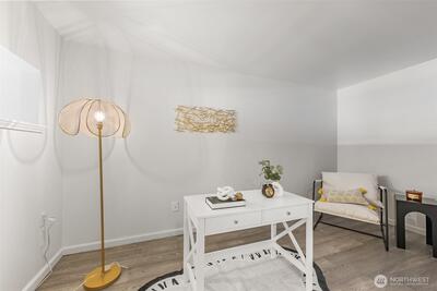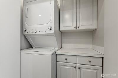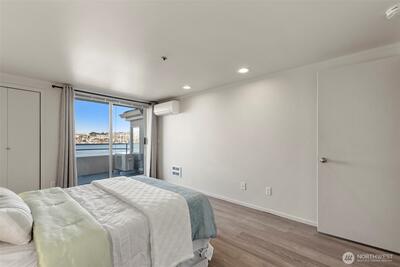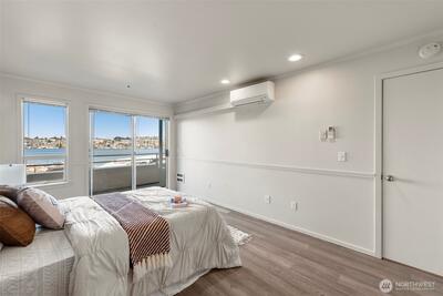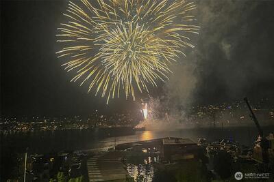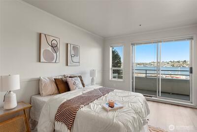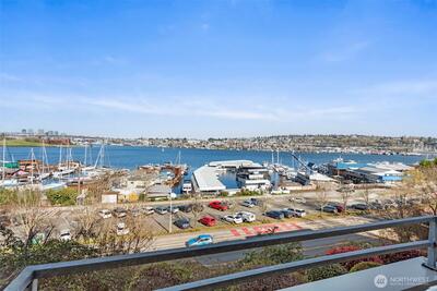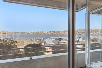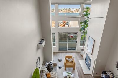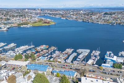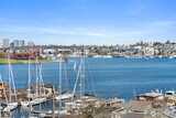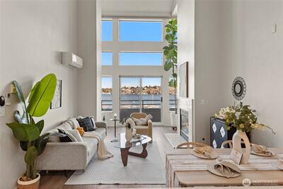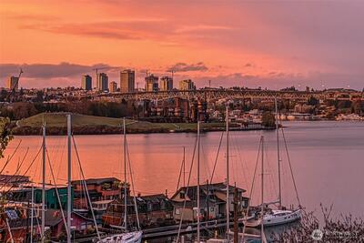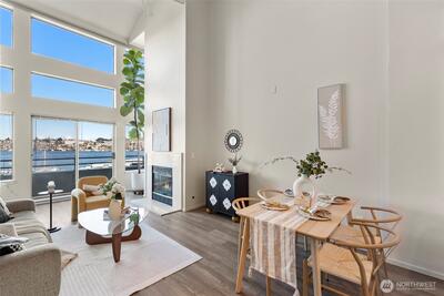 Corner two-level condo with open views of Lake Union, city, and mountains. Floor-to-ceiling windows bring in strong natural light throughout. Balconies on both levels.Main floor features an open kitchen with eating bar, stainless steel appliances, vaulted ceilings, and a gas fireplace. Upper level includes a bedroom, 5-piece bath, and a den suitable for office or additional use. Lower bedroom offers a walk-in closet and access to a Jack-and-Jill full bath.Two additional flex rooms provide options for office, storage, or other uses.Convenient location with easy access to I-5, Hwy 99, South Lake Union, downtown Seattle, and Fremont. Includes one secure garage parking space and a storage unit.