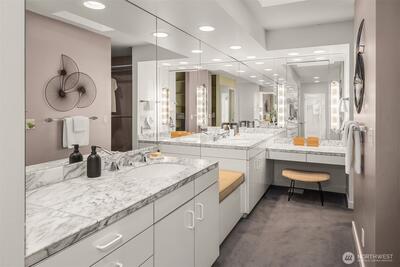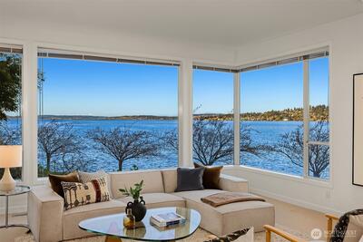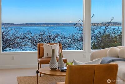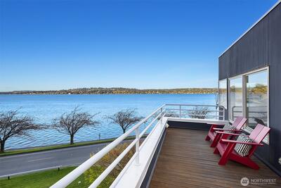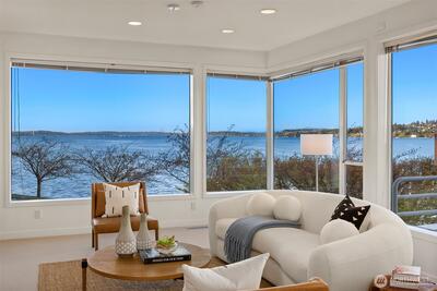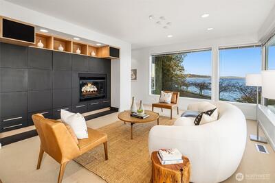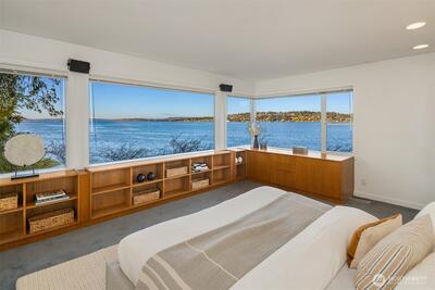 A former Seattle Times/AIA “House of the Month,” this Martin Henry Kaplan–designed residence is a sophisticated and enduring expression of modern architecture. The crown jewel: a dramatic rooftop deck with sweeping views of Lake Washington and the Cascades. Expansive windows carry those vistas into every room, flooding the interiors with natural light. Arranged across three levels, the home offers a double garage and generous storage at street level, open living and entertaining spaces on the main floor, and private bedroom quarters above. Outdoor decks extend from each level, reinforcing a seamless connection between the interiors and the surrounding landscape. The main floor is designed for living and entertaining in equal measure: a spacious eat-in kitchen, inviting family room, two fireplaces, and flexible dining and living areas, all anchored by custom built-ins and Kaplan’s signature detailing. Upstairs, the primary suite offers panoramic lake and mountain views, a spa-li