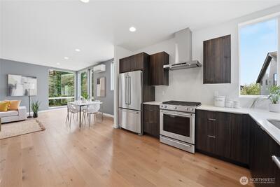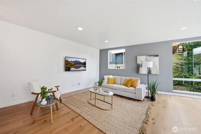 Some rooftop decks have views. This one has front-row seats to fireworks over Lake Union. From your private rooftop terrace, take in shimmering water, Queen Anne to the west, and the Downtown skyline glowing to the south. It is a setting that feels made for summer evenings, sunset dinners, and effortless entertaining. Unlike many rooftop spaces, this one connects seamlessly to the main living areas, creating a natural flow that elevates everyday living as much as special occasions. Inside, the layout is equally refined. Two bedrooms and two full baths are positioned upstairs, while an attached one-car garage offers a rare level of convenience on Yale Ave. No circling for parking. No HOA. Crafted by Blue Fern Development, the home blends modern design with elevated finishes, including wide plank oak floors, KitchenAid stainless appliances, and Moen fixtures throughout. Set in the heart of Eastlake, one of Seattle’s most coveted neighborhoods, this is a home that delivers beauty, funct