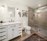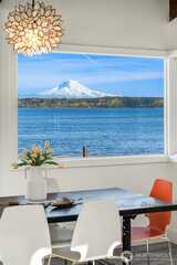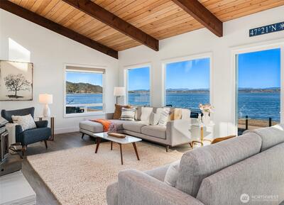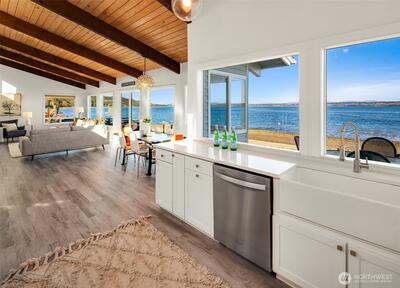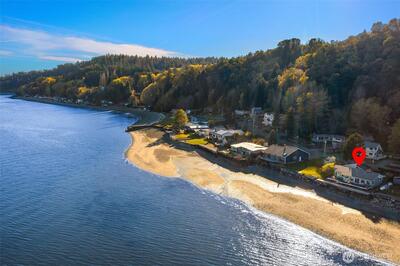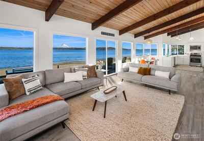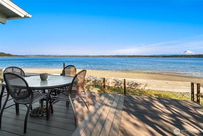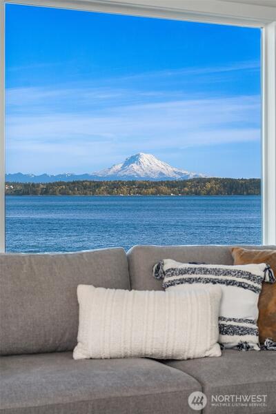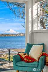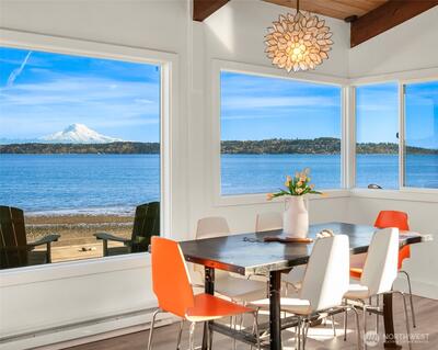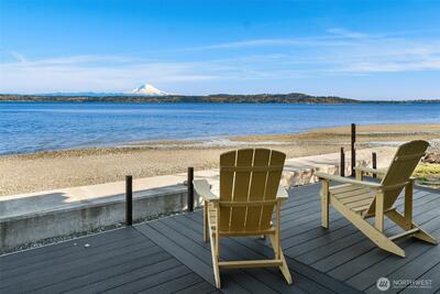 Facing Mt. Rainier, bounded by hundreds of acres of marine park, a step from the long, sandy beach, the uncomplicated livability of this waterfront home is unsurpassed! A wall of windows in the great room and primary suite offer a virtually unlimited view of the mountain, shipping lanes, Cascades and cities across the water. Every important living space overlooks the Sound and Mt. Rainier. A massive bulkhead protects the property from wave action, sheltering the deck, which offers another outdoor room along the waterside of the house. Looking to the southeast, the strait sparkles beyond, illuminating the common rooms at all times of the day. A substantial, attached garage and shop, the neat, manageable yard, makes life at the beach easy-peasy.