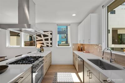 Built to last and ideally located just steps from PCC and neighborhood favorites, this 3 bed, 3 bath luxury townhouse blends quality, function, and style. Thoughtfully designed by Morritt Homes, the open main-floor kitchen, dining, and great room feature tall ceilings, abundant natural light, and hardwood floors throughout the main level, stairs, hallways, and primary bedroom, with no builder-grade shortcuts. The kitchen is both beautiful and highly functional with top-of-the-line appliances, a large walk-in pantry, deep cookware drawers, cookbook shelving, and smart pull-out storage for effortless everyday living. Outdoor spaces set this home apart with an entry-level garden, a large covered deck off the primary suite, and a rooftop view deck with power and a gas hookup for a BBQ or fire pit, perfect for entertaining or enjoying Cascade views. The primary suite occupies its own level with a generous en-suite bath and custom walk-in closet. Two lower-level bedrooms offer flexibility an