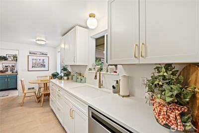 Don't miss this charming turnkey rambler with well over 100k in recent updates, sitting on almost a quarter acre fenced lot. Step into the welcoming living room featuring beautifully refinished hardwood floors, coved ceilings, and a new gas fireplace flanked by custom floating shelves. The dining room leads to a completely remodeled kitchen with breakfast nook. An updated laundry room provides access to the garage and the large fenced yard. Down the hall, you’ll find a remodeled full bath, 2 bedrooms, and a primary suite with remodeled 3/4 bath. Outside, the covered patio gives room to entertain or relax all year round, and a large fenced lot provides ample room to garden. New furnace 2025! Convenient location less than 5 minutes from shopping, restaurants, & the freeway, easy commute to JBLM. Don't forget to ask your agent about our BUYER INCENTIVE!
