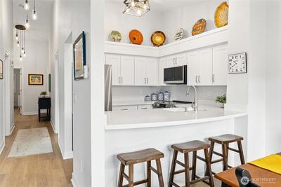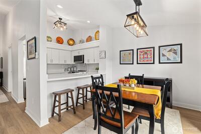 Beautifully remodeled top-floor 3 bed, 1.75 bath unit in the heart of Downtown Issaquah with mountain views. Featuring LVP flooring throughout and a fully updated kitchen with modern finishes and SS appliances. Vaulted ceilings and a private balcony create a bright, open living space ideal for everyday living and entertaining. The primary suite includes an ensuite bath and is thoughtfully positioned for privacy, while the spacious third bedroom/flex space offers versatility for a home office, guest room, or additional living area. Additional updates include new shutters and like-new washer & dryer. Located in Historic Downtown Issaquah just above Front Street—enjoy immediate access to dining, shopping, theatre, parks, and trailheads. Easy commuting, two dedicated parking spaces, community pool, and award-winning Issaquah School District complete this exceptional opportunity.
