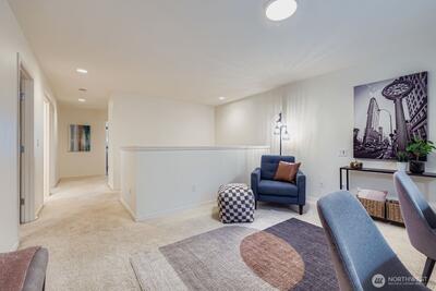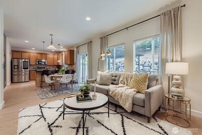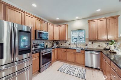 Perched in the desirable Woodridge at North Creek, this beautifully maintained home blends thoughtful design with modern convenience. The main level features wide-plank floors, a bright open layout, gas fireplace, & a chef’s kitchen with granite counters, SS appliances, gas cooktop, walk-in pantry, and smart fridge. A main floor bedroom and full bath offer flexibility for guests or office. Upstairs includes a spacious loft, two more bedrooms, full bath, laundry room, and a large primary suite with sunset views, oversized walk-in closet, dual sinks, and soaking tub. Enjoy central A/C, Level 2 EV charger outlet, 1 gig internet speed, landscaped yard with deck and gazebo, community trails, playground, and easy access to I-405.