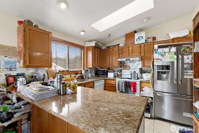 Beautiful split level located in the Beacon Hill community. Home has 3 bedrooms and 3 full baths. Upper level features living room with gas fireplace, spacious kitchen, dining room with access to sun drenched deck. Entertainment sized deck provides great views of Lake Washington and Mt. Rainier great for friends and family. Master bedroom with walk-in closet and master bathroom. Lower level has a huge family/rec room and full bath. Two car garage, gas heat, double paned windows, upgrades to the bathroom, kitchen and stairs and much more. Hardwood floors and skylights. A must see! Near light rail station, bus lines. Short distance to schools, shops, restaurants.