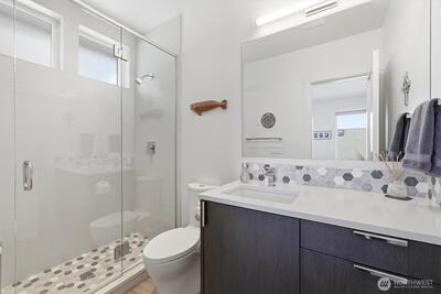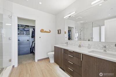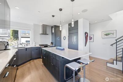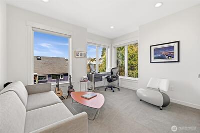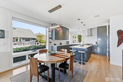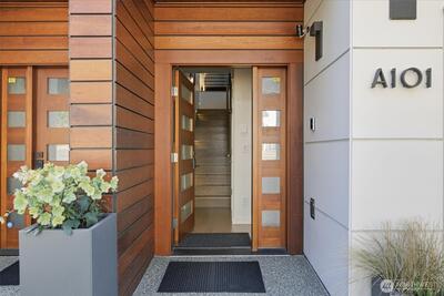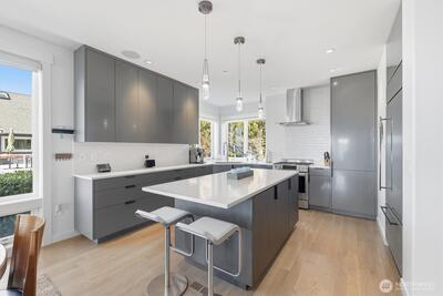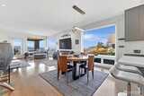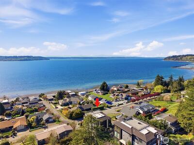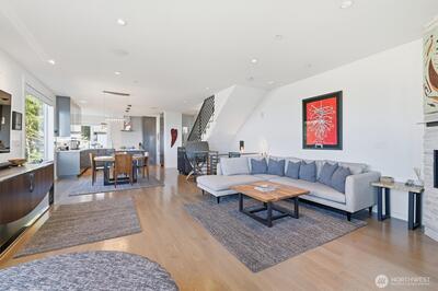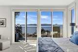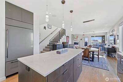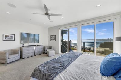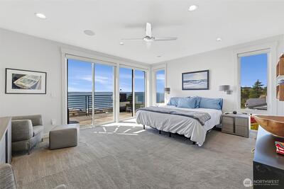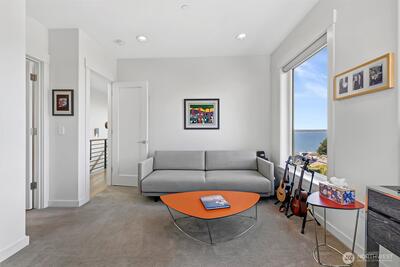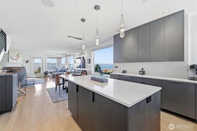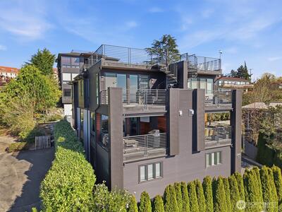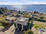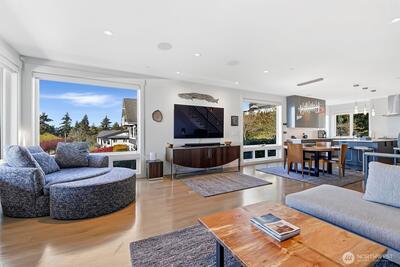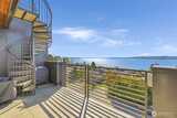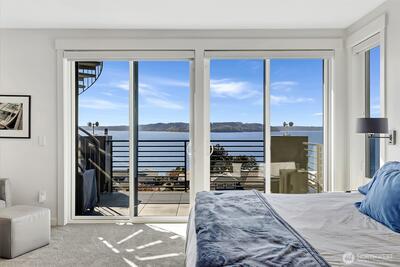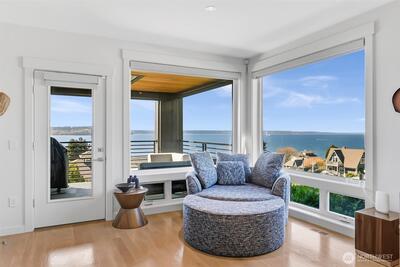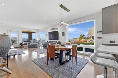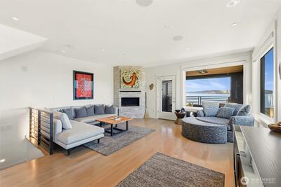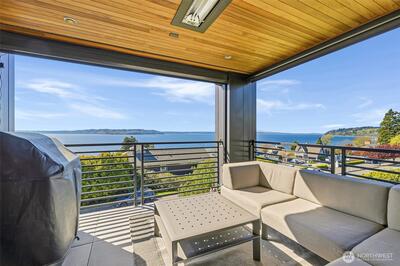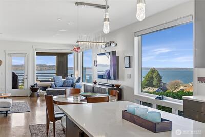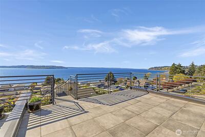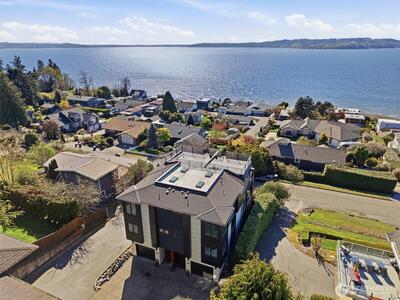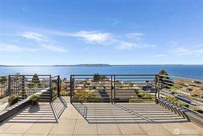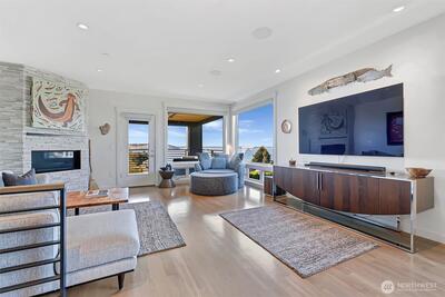 Welcome to luxury living in this exceptional view home. This stunning 2-bedroom, 2.25-bath townhome-style condo showcases breathtaking panoramic views of Puget Sound and the Olympic Mountains from nearly every vantage point. The open-concept main floor is thoughtfully designed with gorgeous hardwood flooring and a cozy gas fireplace, seamlessly connecting to a beautifully appointed gourmet kitchen featuring quartz surfaces, custom cabinetry, a Sub-Zero refrigerator, and high-end appliances. Expansive windows flood the home with natural light, while three private decks—including a covered main-level deck with infrared heating—provide the perfect setting to enjoy passing ships and unforgettable sunsets. The primary suite offers a true retreat with serene water views, a spacious bath, and private access via a spiral staircase to a spectacular rooftop deck. Additional highlights include a rare 2+car tandem garage, generous storage, central A/C, Hunter Douglas remote shades, and smart-h