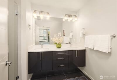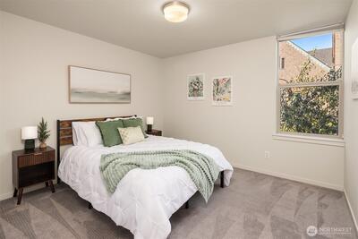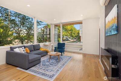 Exceptionally rare opportunity to own a townhome in Ballard with two dedicated off-street parking spots and a full ADU! The main floor entrance welcomes you into a great room with soaring ceilings and wrapped with windows. Venetian plaster accent wall surrounds the gas fireplace and the kitchen features quartz counters, gas range, custom cabinets and large island with eating space. Second level features a primary suite with spa-like bathroom including oversize walk-in shower, double sinks, and walk-in closet. Private and spacious rooftop deck with gas hookup and views of downtown. Lower level ADU is ideal for work-from-home, rental, or multi-generational living featuring full bath, kitchenette, and separate laundry. Walk score of 90!