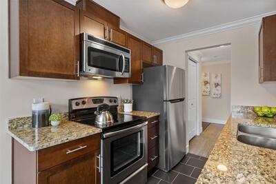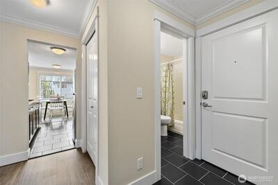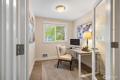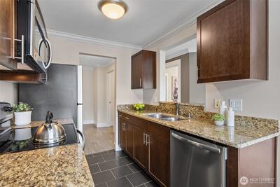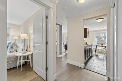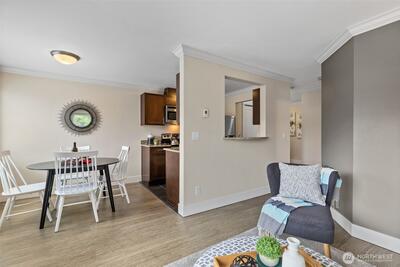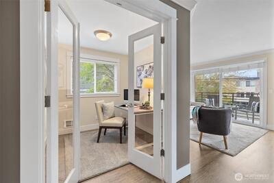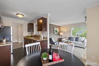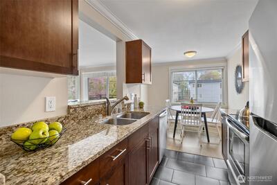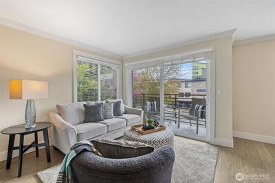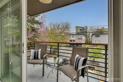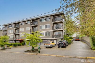 Live in the heart of Ballard in this sun-filled corner unit with a nice-sized bedroom and nearby den/office/guest space which share an updated hall bathroom. You'll appreciate the granite counters, SS appliances and abundant storage in the kitchen, and the dedicated dining area. The living room provides easy access to your south-facing deck, where you can enjoy your morning coffee or evening drinks. Designer colors, solid-surface flooring, and upgraded window coverings make this sweet condo move-in ready. The Oslo offers reserved parking, an elevator, a storage unit, a common recreation room, and secure lobby entrance. 59th Ave NW is a quiet residential street and just blocks away from amazing restaurants, shopping, transit, Ballard Locks, the Burke Gilman Trail, Golden Gardens, the best Sunday farmers' market, and so much more. Who needs a car? This location has it all!
