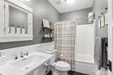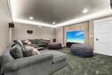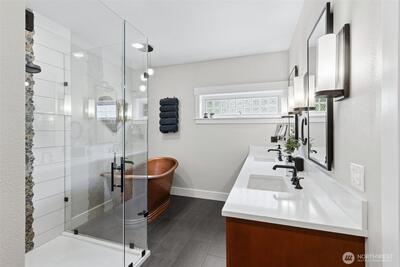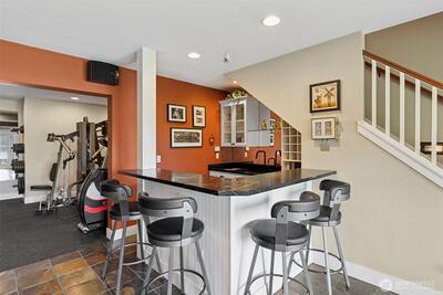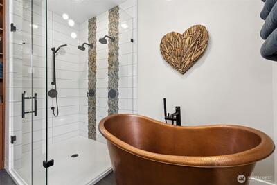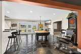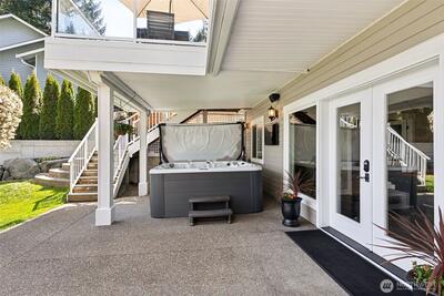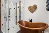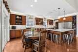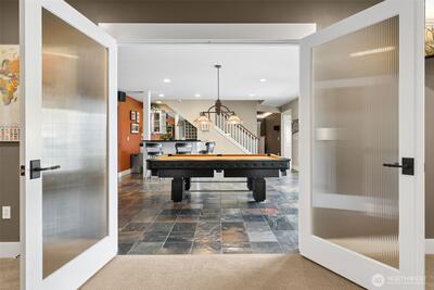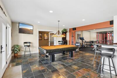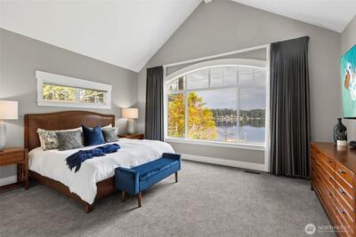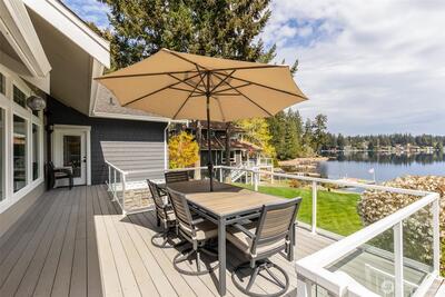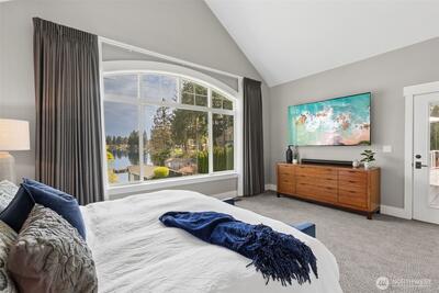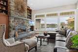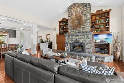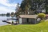 Long Lake Country Club waterfront w/luxury boathouse pairs 53' of sandy beach w/a 45-foot dock & heated boathouse w/remote lift system for easy dry docking. Enjoy Mt Rainier view & gently sloped, sand beach water entry with hot tub covered patio, custom covered BBQ area w/lighting for all-weather use & a built-in gas fire-pit creating multiple spaces to gather. Inside, the tone is expansive w/vaulted ceilings, 9' heights throughout & rich hickory hdwds on main level. The living rm anchors the home w/a floor-to-ceiling stone gas fireplace, built-ins, & wall of windows framing the lake. Huge white quartz kitchen, large island w/6-burner gas cooktop, TWO fridge/freezer units, & walk-in pantry w/2nd oven & microwave. View-filled vaulted main floor primary suite & door to hot tub access gives retreat vibes, while remodeled en suite leans into spa energy w/hammered copper vessel tub & low-threshold glass tile shower. Multigenerational flexibility is found in the daylight lower level w/2 dens