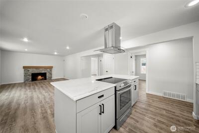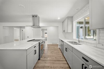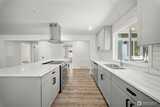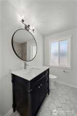 Enjoy the city life in the heart of Tumwater! Fully remodeled Mid-century Modern Rambler, closeto Costco, Fred Meyer, and Walmart. Quick access to I-5 + bus stop across street. Open layout includes 4 bedrooms, and2 baths. Stunning designer finishes throughout include granite counters, tile back-splash, stainless steel appliances, andexposed wood shelving in kitchen, custom tiled baths, stone fireplace, and wood wrapped windows. HUGE corner lotwith potential to build ADU or shop.