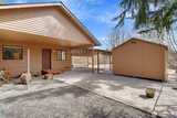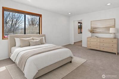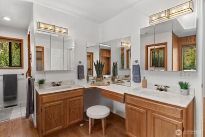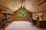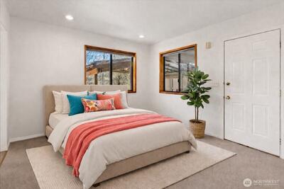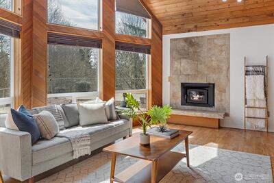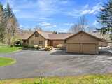 Tucked behind a gated entry on 5 serene acres, this custom cedar home offers privacy, space, & breathtaking Mt. Rainier views. The 2,526 sq ft rambler-style floorplan w/ loft features 3 bedrooms and 3 bathrooms, thoughtfully designed with separate wings for comfortable living.The stunning A-frame living space is the heart of the home, showcasing soaring tongue-and-groove ceilings, expansive windows that flood the room with natural light, & solid hardwood floors throughout. The traditional kitchen features beautiful woodwork, a dedicated eating area, and opens seamlessly to the living space, while a separate dining room & additional living room provide flexibility for entertaining. One wing of the home is dedicated to a spacious primary suite w/ private ensuite bath, soaking tub, & large sauna. The opposite wing offers 2 additional bedrooms, 2 bathrooms, & an oversized mudroom/utility space. With its layout & separate entry, this side of the home could easily be converted into a multi-