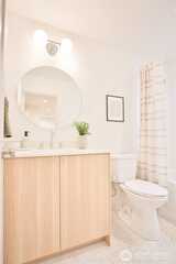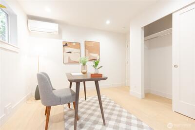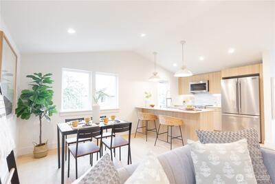 Welcome to this community of three newly built modern homes in Seattle’s vibrant Central Area, crafted by Bungalow Building. Thoughtfully designed with contemporary living in mind, each home features an open-concept floor plan, premium finishes, and dedicated off-street EV-capable parking. This two-story, 1,073 sq ft detached residence offers a main-level entry featuring two bedrooms, a full bath, laundry closet, and a sliding glass door to access a private patio. Upstairs, the second level includes an open living and dining area, a U-shaped kitchen with a large peninsula quartz countertop, modern Bellmont cabinetry, stainless steel appliances/induction range. This floor also features the primary suite with a walk-in closet and full bath. High-end details throughout include engineered wide-plank oak flooring, smooth wall finish, custom tilework, frameless glass showers, private outdoor space, and energy-efficient mini-split heating and A/C on all floors. Ideally located just minutes