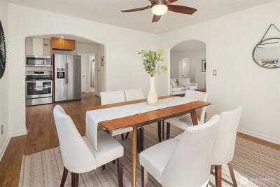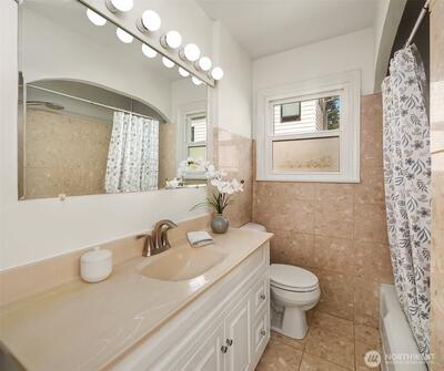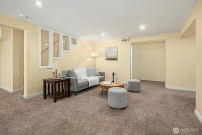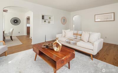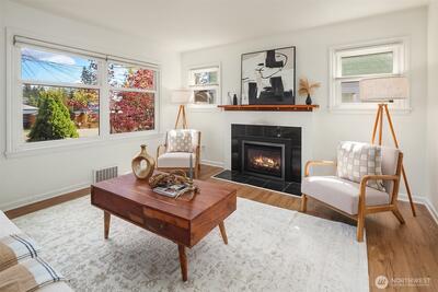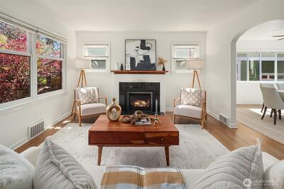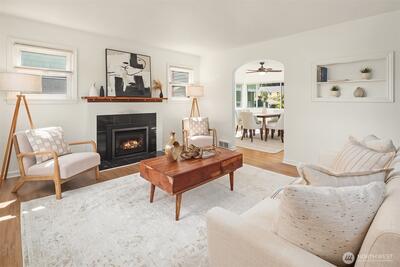 Charming 1940s home nestled in a private setting in Seattle’s sought-after Broadview neighborhood. This spacious 4-bed, 2-bath residence beautifully blends timeless character with everyday livability. The sun-drenched main floor features graceful archways that create a seamless flow between rooms, enhancing the home’s classic charm. Enjoy a bright and inviting living room with a cozy gas fireplace, a formal dining room, and a convenient main-level primary bedroom alongside a full bathroom. The kitchen features warm cabinetry with stainless steel appliances. Downstairs, the lower level offers excellent flexibility with a spacious rec room, an additional bedroom, a full bathroom, and a utility room perfect for guests, hobbies, or multi-generational living. Step outside to the deck and patio ideal for entertaining or relaxing along with a fenced backyard and generous garden space ready for your personal touch. A detached garage adds everyday convenience. Ideally located just minutes