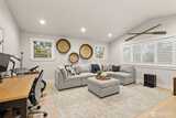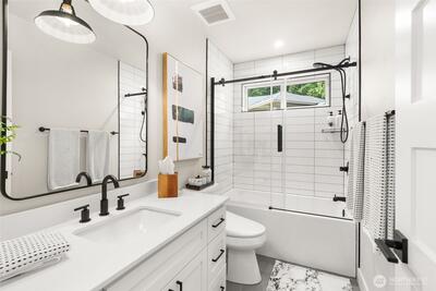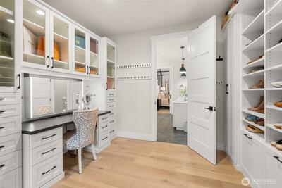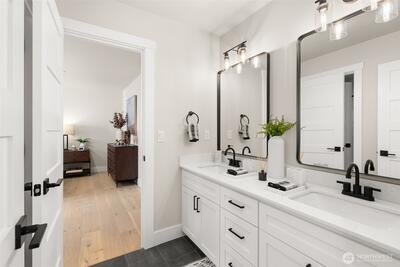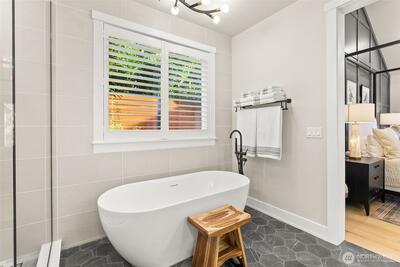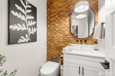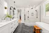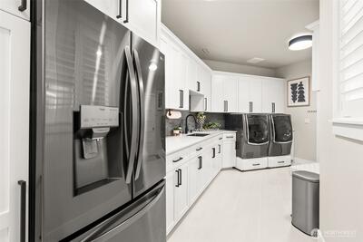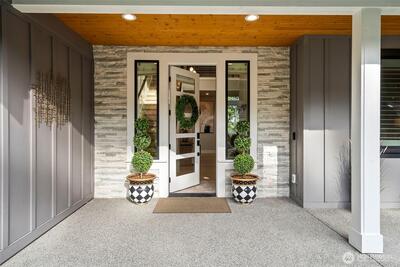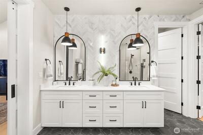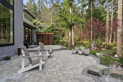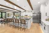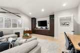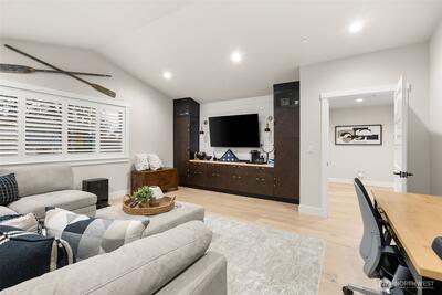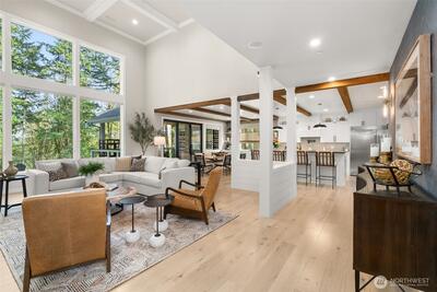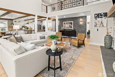Set within a gated enclave of luxury homes, this impeccably maintained home offers over 4,200 square feet with 4 bedrooms and 3.5 bathrooms on a flat cul-de-sac, just 5–7 minutes from top-rated schools, Uptown Gig Harbor, downtown, shopping, and freeway access. Built by Harbor Rock Construction, a local builder known for exceptional craftsmanship and attention to detail, it has been further elevated with over $150k in improvements completed within the past two years. The open-concept kitchen and dining area is anchored by reclaimed wood beams and flows into a dramatic two-story living room with floor-to-ceiling windows overlooking the greenbelt, bringing the outdoors in. A box beam ceiling adds architectural detail, while multi-panel folding glass doors create seamless indoor-outdoor living, opening to a covered patio with a stacked stone fireplace and hidden TV alcove. The chef’s kitchen features three ovens, a GE Café 36” range, column refrigerator and freezer, abundant
