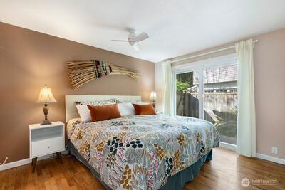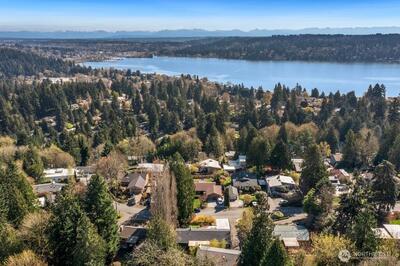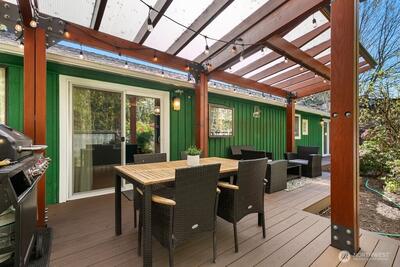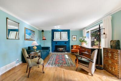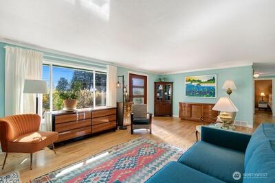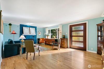 Step through the custom pivot door into this light-filled Lake Forest Park home, thoughtfully designed for effortless single-level living. Warm hardwood floors run throughout, creating a seamless flow from the inviting living area into the beautifully updated kitchen—ideal for both everyday living and entertaining. A dedicated dining room offers the perfect setting for gatherings, while the nearby covered deck extends your living space outdoors for year-round Pacific Northwest enjoyment. The versatile layout features three well-appointed bedrooms sharing a spacious bath, along with an expansive second living area that easily serves as a private retreat, media room, or home office. An organized utility room provides convenient space for laundry and extra storage. Enjoy peace of mind with major updates already completed, including a newer roof, heat pump, and electrical panel, plus a brand-new driveway and refreshed front garden. Deeded LFP Civic Club membership adds even more value to