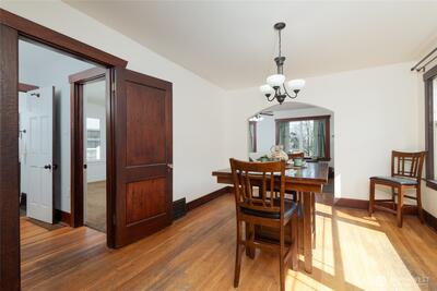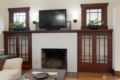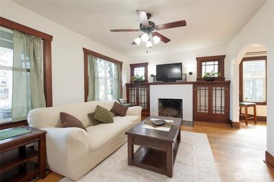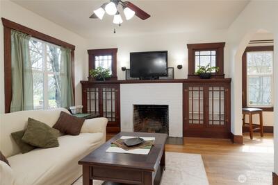 You’ll fall in love with this beautifully remodeled home, thoughtfully updated in 2010 while maintaining its original charm. Rich stained mahogany woodwork adds warmth and character throughout. The spacious living room features a cozy fireplace flanked by built-in cabinetry, creating an ideal gathering space. A generously sized dining room showcases an oversized window that fills the space with natural light. The kitchen is both stylish and functional, offering wood cabinetry, granite countertops, and stainless steel appliances. Hardwood floors run throughout the living room kitchen, and dining rooms, complemented by slate flooring in the bathrooms and utility room. Additional updates include vinyl windows, roof, gutters, doors, carpet, and bath vanities - all completed in 2010. Enjoy relaxing on the covered front porch and back patio. Take advantage of the oversized detached garage with its own separate electrical panel. A new sewer line was just installed for added peace of mind. D