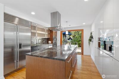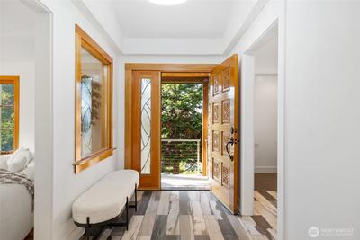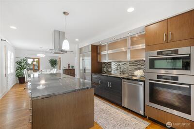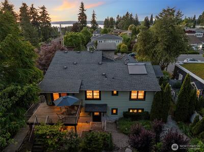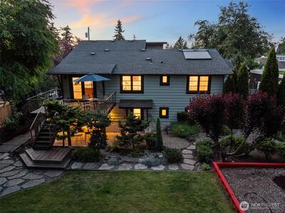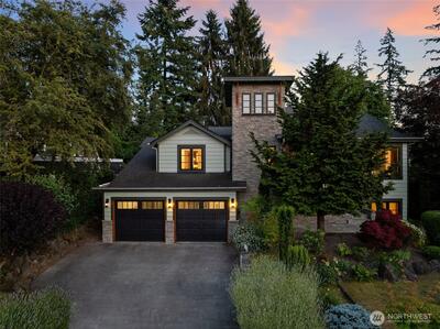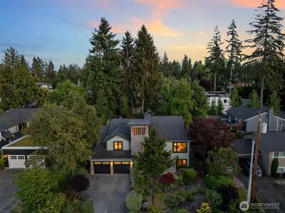 This stunning Clyde Hill residence, beautifully remodeled in 2014, blends contemporary design with architecturally inspired details. The main level features three bedrooms, two full bathrooms, and a powder room. The above-ground lower level offers exceptional flexibility with its own locked exterior entrance, a full bathroom, one bedroom, a media room, a large office/multipurpose room, and an additional office currently used as a bedroom. Thoughtfully curated finishes include Kolbe aluminum/wood-clad windows framed in custom Douglas Fir, an Apricus solar water system, and designer selections such as Artemide lighting, Italian tile, and Miele appliances. The Ipe deck with stainless steel cable railing creates a sleek, modern outdoor retreat. Nestled in a quiet oasis just two blocks from top-rated schools, this prime location offers quick access to downtown Bellevue, 405 and 520, and an easy commute to Seattle, Redmond, and South Lake Union. Drought-resistant landscaping completes this