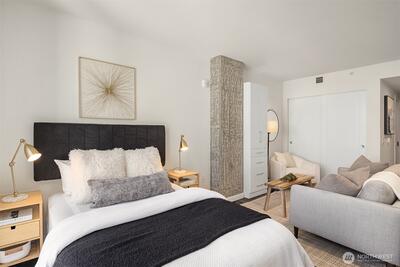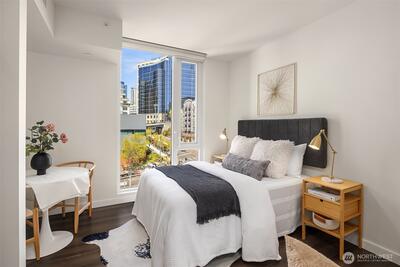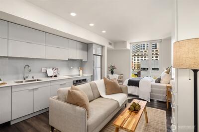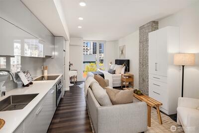 Experience refined urban living at KODA Condominiums, a striking 2021-built 17-story residence ideally positioned at the crossroads of Downtown Seattle, Chinatown–International District (Japantown), and historic Pioneer Square—one of the city’s most culturally rich and rapidly evolving neighborhoods. Just moments from Seattle’s revitalized waterfront along Elliott Bay, enjoy parks, promenades, dining, and easy access to Pike Place Market and the Seattle Aquarium via the iconic Overlook Walk. Near Lumen Field and T-Mobile Park for Seahawks, Mariners, Sounders, concerts, and FIFA World Cup 2026 excitement. This thoughtfully designed studio with full bath offers ADA-compliant features for ease and long-term livability, paired with modern finishes. Enjoy central A/C, engineered wood flooring, Lutron automatic solar shades, a sleek kitchen with Blomberg appliances and Fulgor range, side-by-side Blomberg W/D. KODA amenities include a rooftop retreat with BBQs and sweeping west-facing