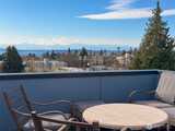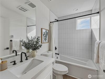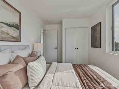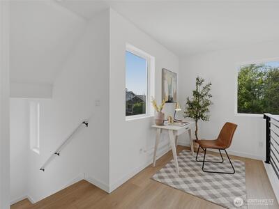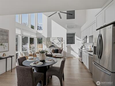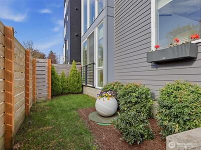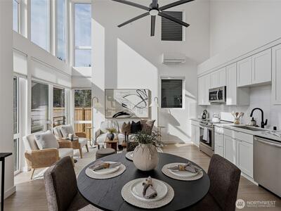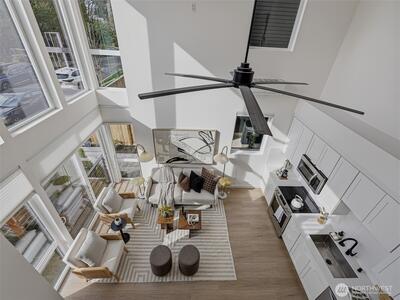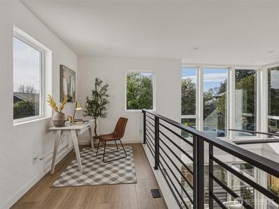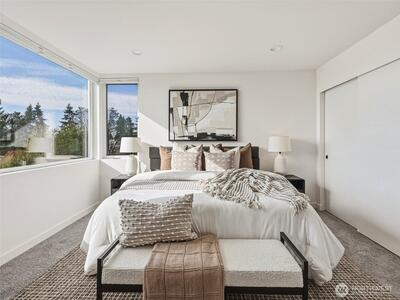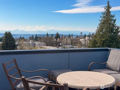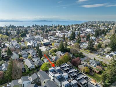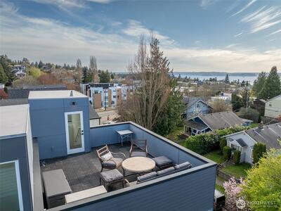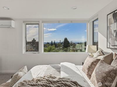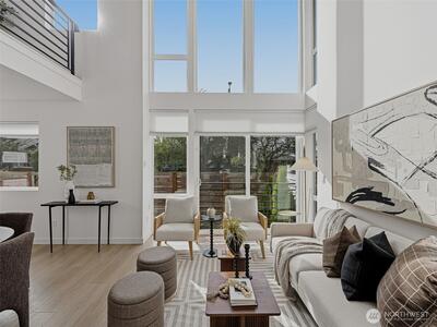 Experience elevated West Seattle living in this stunning end-unit townhome, where sweeping Puget Sound and mountain views set the tone for everyday luxury. Step inside to a fully fenced yard, providing a welcoming entry and private outdoor space, along with convenient exterior storage. Bathed in natural western light, this thoughtfully designed home features an open-concept main level with soaring ceilings. The chef’s kitchen is beautifully appointed with custom cabinetry, quartz countertops, and stainless steel appliances, seamlessly connecting to the living area. A versatile lofted foyer space above offers the ideal setting for a home office or dining area. Upstairs, two spacious bedrooms and a dedicated laundry area occupy the third floor, while the top-level primary suite offers a true retreat—complete with expansive views, generous proportions (comfortably fitting a CA King), and exceptional privacy. The rooftop deck creates an unforgettable backdrop for entertaining or unwind
