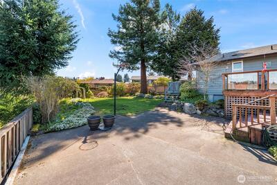 Puget Sound and Olympic Mountain views from this well loved, well maintained west end home - desirable enclave in North Tacoma, close to the Narrows Passage and Point Defiance. Beautiful living room with fireplace has views of the sound and Olympics. Dining room flows into eat-in kitchen which has maple shaker cabinets, granite countertops, tile backsplash, ceramic tile floor and recessed lighting. Generous primary suite has slider to deck, walk-in closet and private updated bath. Three bedrooms on main level as well as a full main floor bath with lovely updates. Lower level offers a large family room, ¾ bath bedroom. Features include a large yard with 3 decks, garden area and mature landscaping, 2015 roof with solar panels, hardwoods, new heat pump -2023, air conditioning (A/C) and abundant windows to enjoy the view.